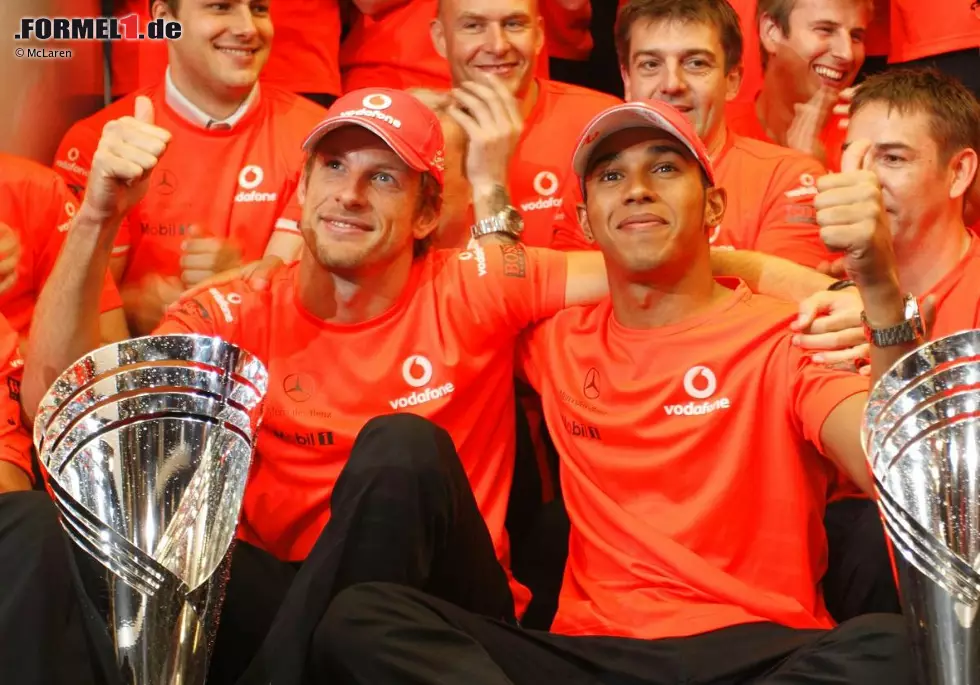 Harmonie pur bei McLaren: Obwohl Jenson Button nach seiner unverschuldeten Kollision mit Sebastian Vettel extrem frustriert war, freute er sich mit seinem Teamkollegen über dessen Triumph.