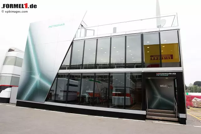 In dieser Liga der Super-Motorhomes kann Lotus nicht ganz mitspielen. Zwei Lastwagen links und rechts, dazwischen zwei überdachte Konstruktionen mit zentralem Zugang. Fertig ist das Motorhome von Kimi Räikkönen und Romain Grosjean. Es wirkt angesichts der Prachtbauten der Konkurrenz fast ein ein bisschen fehl am Platze.