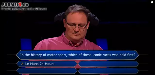 Es handelt sich um eine Motorsport-Frage. "Welches dieser ikonischen Rennen wurde in der Geschichte des Motorsports als erstes ausgetragen?", will Moderator Jeremy Clarkson von Townsley wissen.