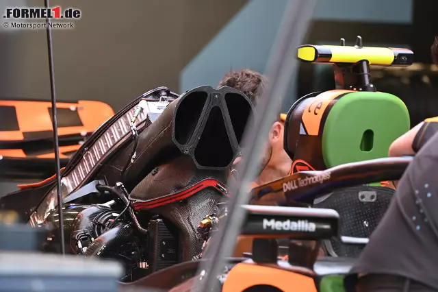 Eine Nahaufnahme des vorderen, verschnörkelten Abschnitts des "Edge-Wings" des MCL60 mit drei Streben, die dazu dienen, den Luftstrom zu steuern, wenn er nach außen geleitet wird. Zu beachten sind auch die Metallhalterungen, die so geformt und ausgerichtet sind, dass sie die Richtung des Luftstroms beeinflussen.