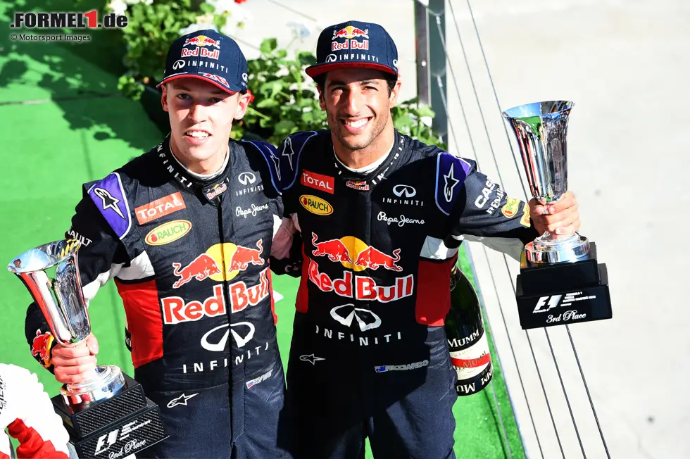 #7 Daniil Kwjat (21 Jahre, 3 Monate) - Schon etwas mehr Erfahrung hat Daniil Kwjat, als er in Ungarn 2015 Zweiter hinter Sebastian Vettel und vor Teamkollege Ricciardo wird. Nach einer Saison bei Toro Rosso wird er für 2015 zu Red Bull hochgezogen, wo es bis zum zehnten Saisonlauf dauert, bis er Champagner kosten darf.