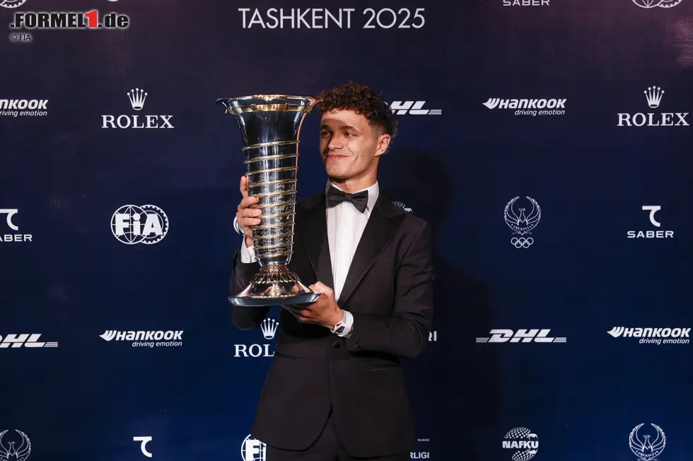 12. Dezember 2025: Lando Norris erhält bei der FIA-Gala in Usbekistan den WM-Pokal und ist damit offiziell Formel-1-Weltmeister.