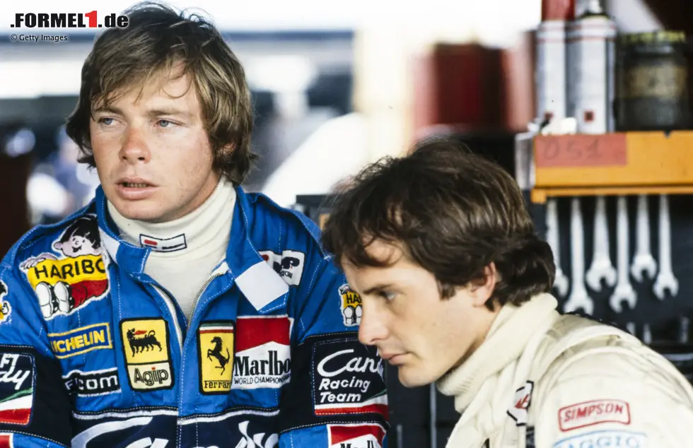 ... sieht mit Didier Pironi (links im Bild) nie das Ziel auf einem Top-3-Rang. Mehr als Platz vier in Monaco schafft Pironi nicht. Das bedeutet am Ende WM-Position 13. Aber: 1982 gewinnt er zwei Rennen und ist bis zu seinem schweren Unfall WM-Favorit für Ferrari.