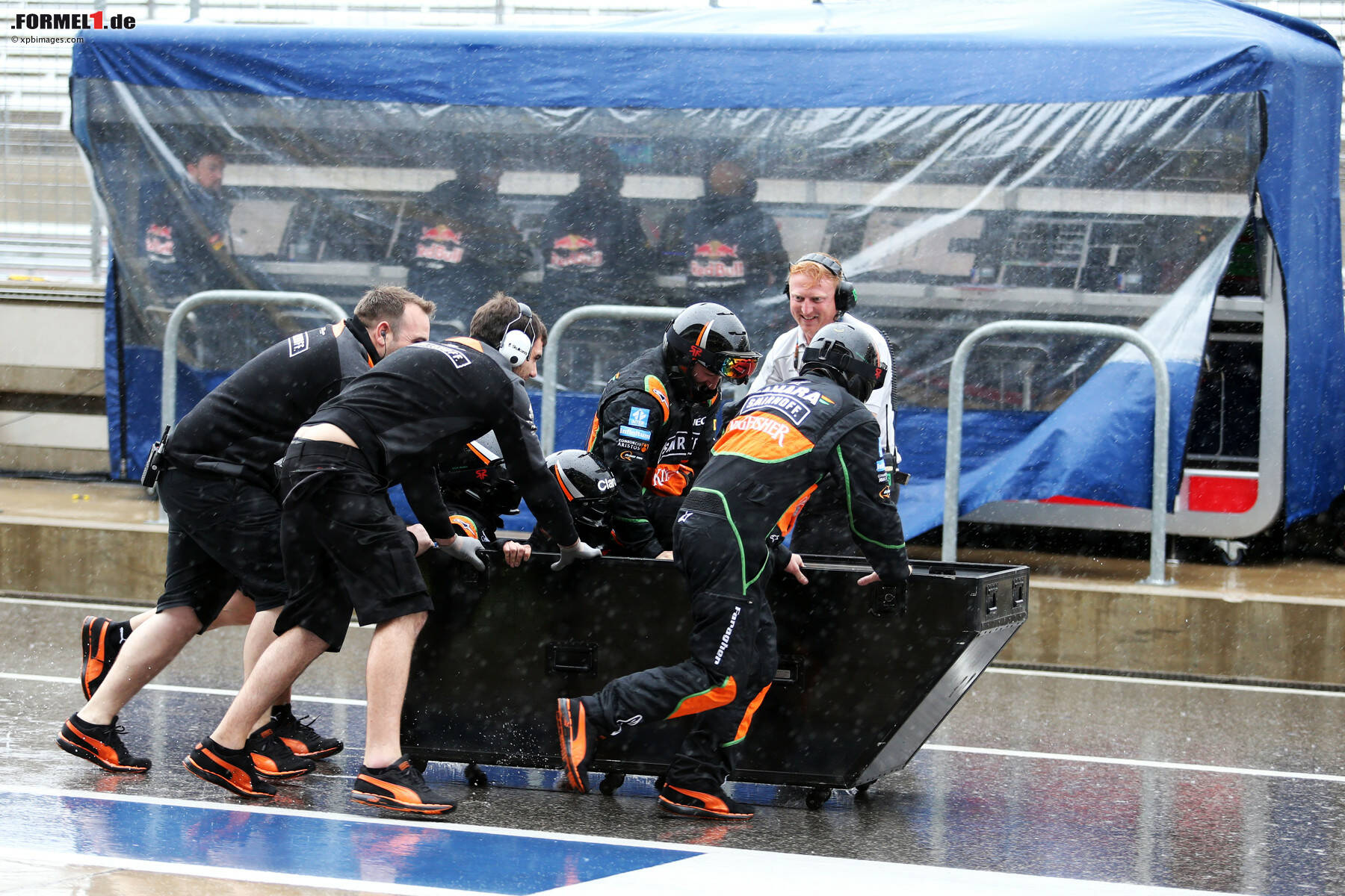 Beim Williams-Team setzte man hingegen auf pure Manneskraft der Boxencrew und bildete ein imaginäres Ruderboot. Ebenfalls sehr einfallsreich und originell gestaltete ein Mechaniker des Force-India-Teams die unfreiwillige Unterbrechung: Er offenbarte den ausharrenden Fans auf der Haupttribüne ungeahnte Breakdance-Fähigkeiten und legte auf dem Garagenboden eine kleine Einlage hin.
