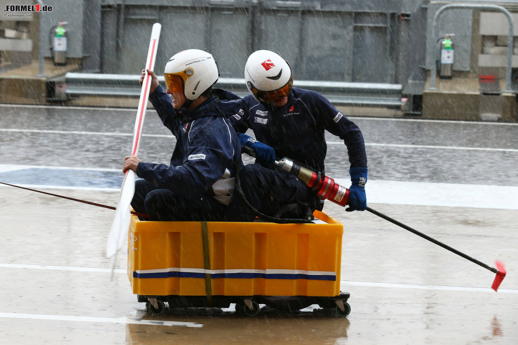 Das Entertainment-Programm in der Boxengasse gestaltete sich ganz nach dem Motto "Not macht erfinderisch": Besonders originell ging man zuerst bei Sauber und später - die Idee wurde beinhart abgekupfert - auch bei Force India ans Werk. Die Mechaniker und Ingenieure zeigten vollen Körpereinsatz und bauten aus Teilen des Garageninventars kurzerhand Boot-ähnliche Vehikel, mit denen im Anschluss "Testfahrten" in der Boxengasse veranstaltet wurden. Leider konnte kein eindeutiger Sieger ausgemacht werden...