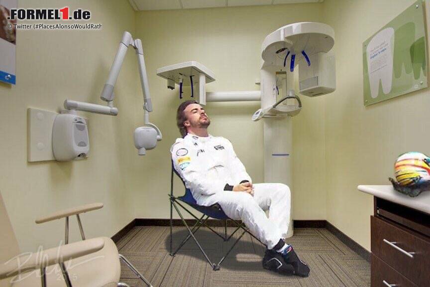 Ob beim Zahnarzt, auf dem Mond, auf der Sonnenbank mit Forrest Gump oder in der Porsche-Box: Die Fotostrecke zum aktuellen Alonso-Hype auf Twitter