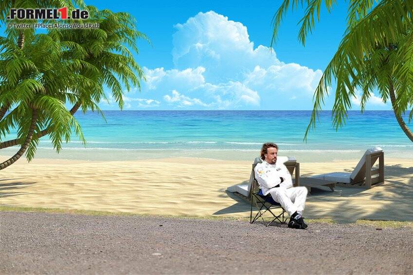 #PlacesAlonsoWouldRatherBe gehörte am Samstag zeitweise zu den meistgesuchten Hashtags auf Twitter, und das an einem Tag, an dem die Anschläge von Paris, der Syrien-Gipfel in Wien und das Zugunglück von Straßburg das Weltgeschehen dominierten. Die Idee ist simpel: Man nehme das Foto von Alonsos "Sonnenbad" nach dem Motorschaden, schneide es aus, kopiere es passend in einen anderen Hintergrund und poste es auf Twitter, Instagram & Co.