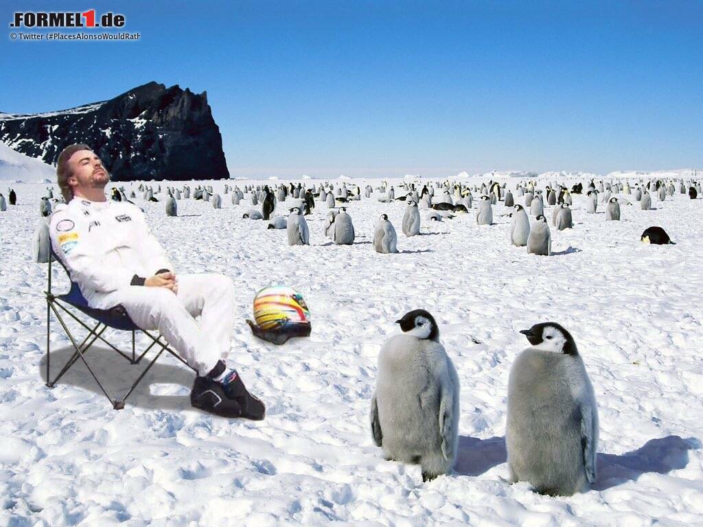 #PlacesAlonsoWouldRatherBe gehörte am Samstag zeitweise zu den meistgesuchten Hashtags auf Twitter, und das an einem Tag, an dem die Anschläge von Paris, der Syrien-Gipfel in Wien und das Zugunglück von Straßburg das Weltgeschehen dominierten. Die Idee ist simpel: Man nehme das Foto von Alonsos "Sonnenbad" nach dem Motorschaden, schneide es aus, kopiere es passend in einen anderen Hintergrund und poste es auf Twitter, Instagram & Co.