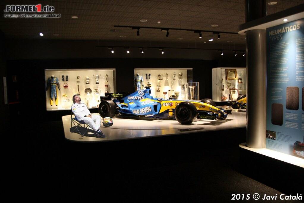 #PlacesAlonsoWouldRatherBe gehörte am Samstag zeitweise zu den meistgesuchten Hashtags auf Twitter, und das an einem Tag, an dem die Anschläge von Paris, der Syrien-Gipfel in Wien und das Zugunglück von Straßburg das Weltgeschehen dominierten. Die Idee ist simpel: Man nehme das Foto von Alonsos "Sonnenbad" nach dem Motorschaden, schneide es aus, kopiere es passend in einen anderen Hintergrund und poste es auf Twitter, Instagram & Co.