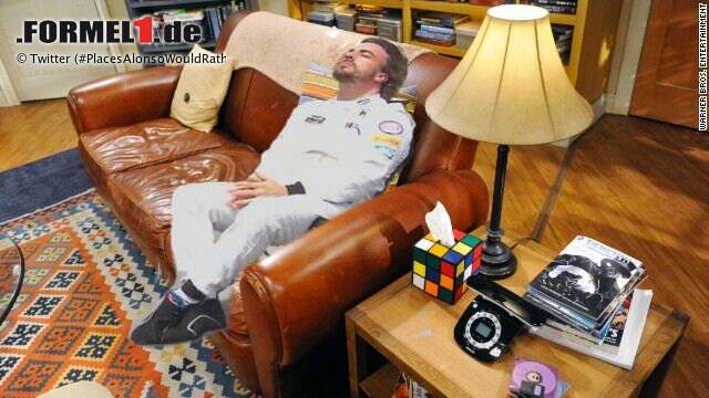 Was dabei herauskam, sind teilweise echte Schenkelklopfer. Etwa ein Alonso, der Sheldon Cooper aus der "Big Bang Theory" dessen berühmten Sitzplatz auf der Ledercouch wegnimmt, Alonso beim Zahnarzt, auf einer Mülldeponie, auf dem Mond oder auch in der Porsche-Box in Le Mans - eben überall, wo er gerade lieber wäre als bei McLaren-Honda.
