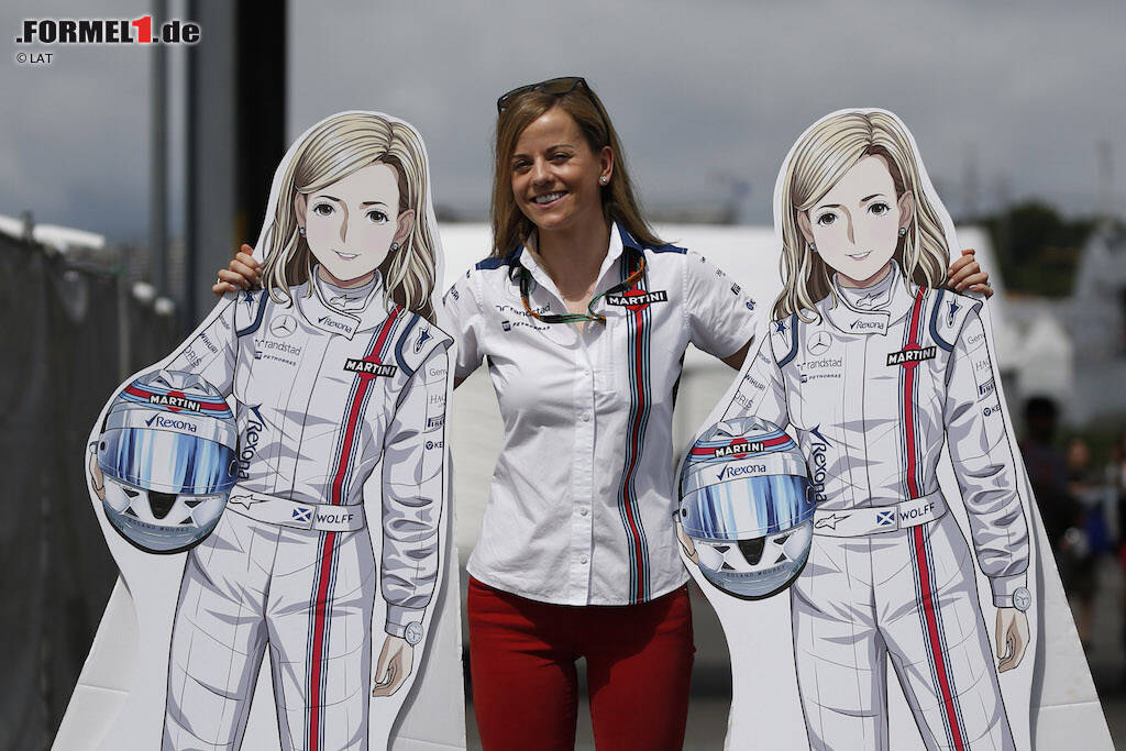 Glücklich verheiratet ist stattdessen diese Dame: Die scheidende Williams-Entwicklungspilotin Susie Wolff, Ehefrau des Mercedes-Sportchefs Toto Wolff, beendete ihre Formel-1-Karriere, fand im Paddock aber viele Freunde und bestritt 2015 zwei Freie Trainings. Die beiden Pappkameradinnen zählen wir ausnahmsweise nicht zu den Bekanntschaften hinzu.