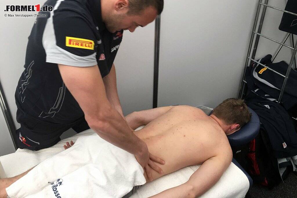Apropos körperliche Ertüchtigung: Max Verstappen genießt diese Massage weniger, als es auf den ersten Blick den Anschein haben mag. Sein Physiotherapeut ist ein ehemaliger Rugbyspieler.