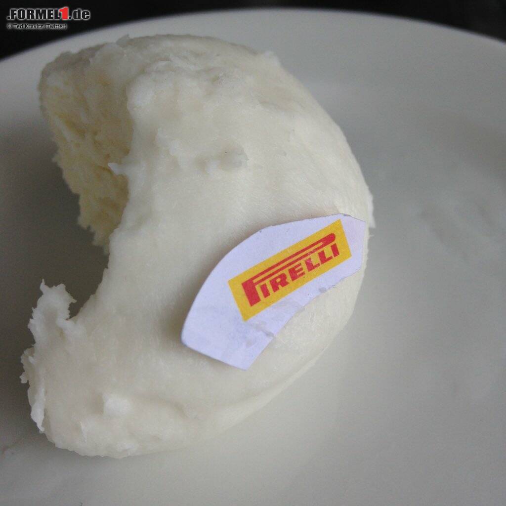 Graining mal anders erklärt: TV-Moderator Ted Kravitz schnappt sich ein Mozzarella-Bällchen, um vor laufender Kamera zu demonstrieren, wie sich die Laufflächen der Formel-1-Reifen abrubbeln. Natürlich stilecht mit Pirelli-Branding.