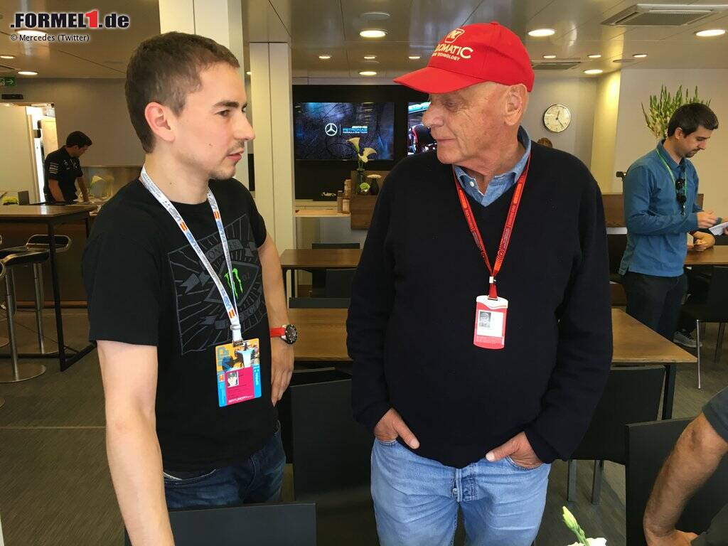 Zum Europa-Auftakt der Formel 1 verirren sich immer auch ein paar Promis. Hier im Gespräch mit Niki Lauda: MotoGP-Weltmeister Jorge Lorenzo, der den gleichen Energydrink-Sponsor hat wie das Mercedes-Team. 2017 übrigens nicht mehr. Dann wechselt er zu Ducati, quasi dem "Ferrari auf zwei Rädern".