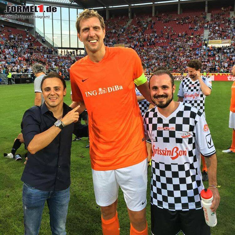 Organisiert wird der Benefiz-Kick "Champions for Charity" übrigens von Basketball-Superstar Dirk Nowitzki, neben dem die beiden Massa-Brüder Felipe und Dudu wie kleine Zwerge aussehen.