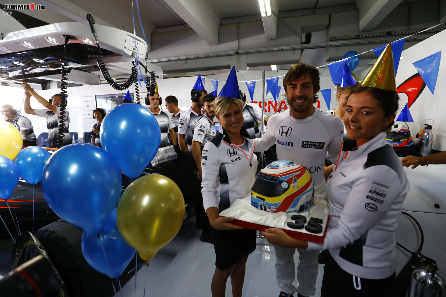 Happy Birthday, Fernando Alonso! Der McLaren-Star feiert am Freitag seinen 35. Geburtstag und wird von seiner Crew mit einer Torte im eigenen Helmdesign überrascht. Die Kalorien sind dann auch drin, denn vom Siegerschampus hat Alonso ohnehin seit Barcelona 2013 nicht mehr geschlürft.