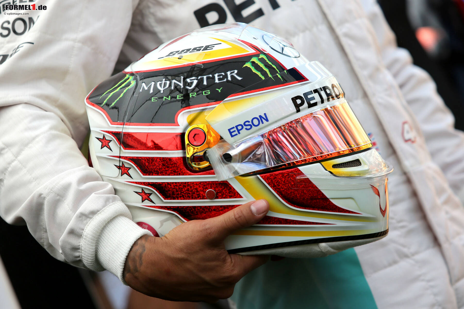 (Motorsport-Total.com) - Silbernes Auto und ein weißer Helm: Jeder Formel-1-Fan weiß, dass das nur Lewis Hamilton sein kann. Doch was steckt eigentlich hinter dem Kopfschutz-Look des Champions? Im Gespräch mit 'Formula1.com' klärt er auf, welche Idee dem Design mit viel Weiß und gelben Verzierungen zugrunde liegt. Die drei Sterne hinter dunkelroten Streifen signalisieren seine drei WM-Titel, ein vierter Streifen ohne Stern ist eine Art Motivationshilfe. "Es war ganz unbewusst", sagt Hamilton.