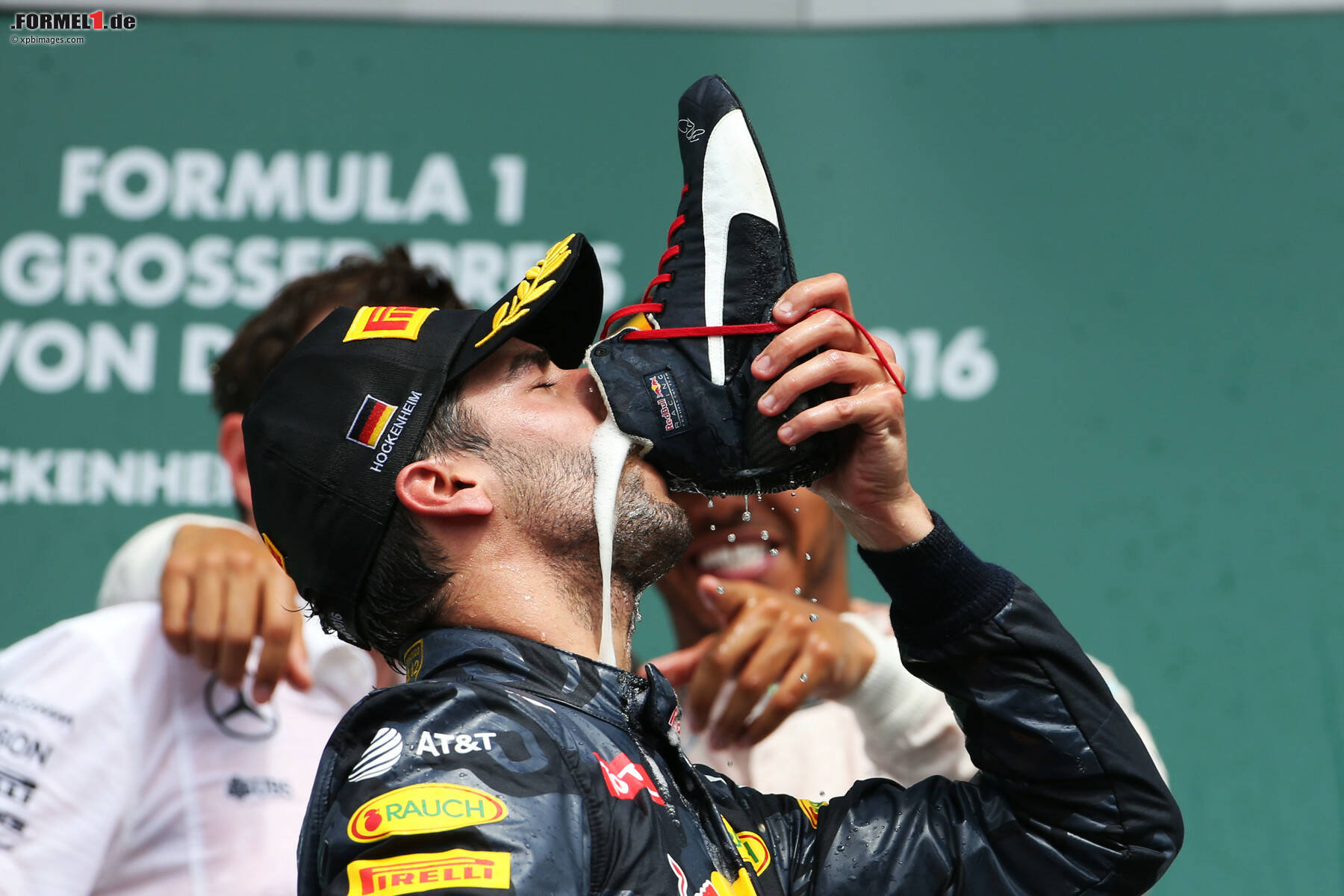 Der stets gut gelaunte Australier brachte zuletzt den sogenannten "Shoey" in die Formel 1. Dabei trinkt der 27-Jährige den Champagner nicht etwa direkt aus der Flasche - sondern aus seinem Schuh! Doch wie kommt man auf so eine Idee? "Ich habe nicht damit angefangen", verteidigt sich Ricciardo mit einem Lachen und erklärt: "Soweit ich weiß, habe ich in der Formel 1 damit angefangen, aber nicht weltweit. Es waren ein paar verrückte Aussies."
