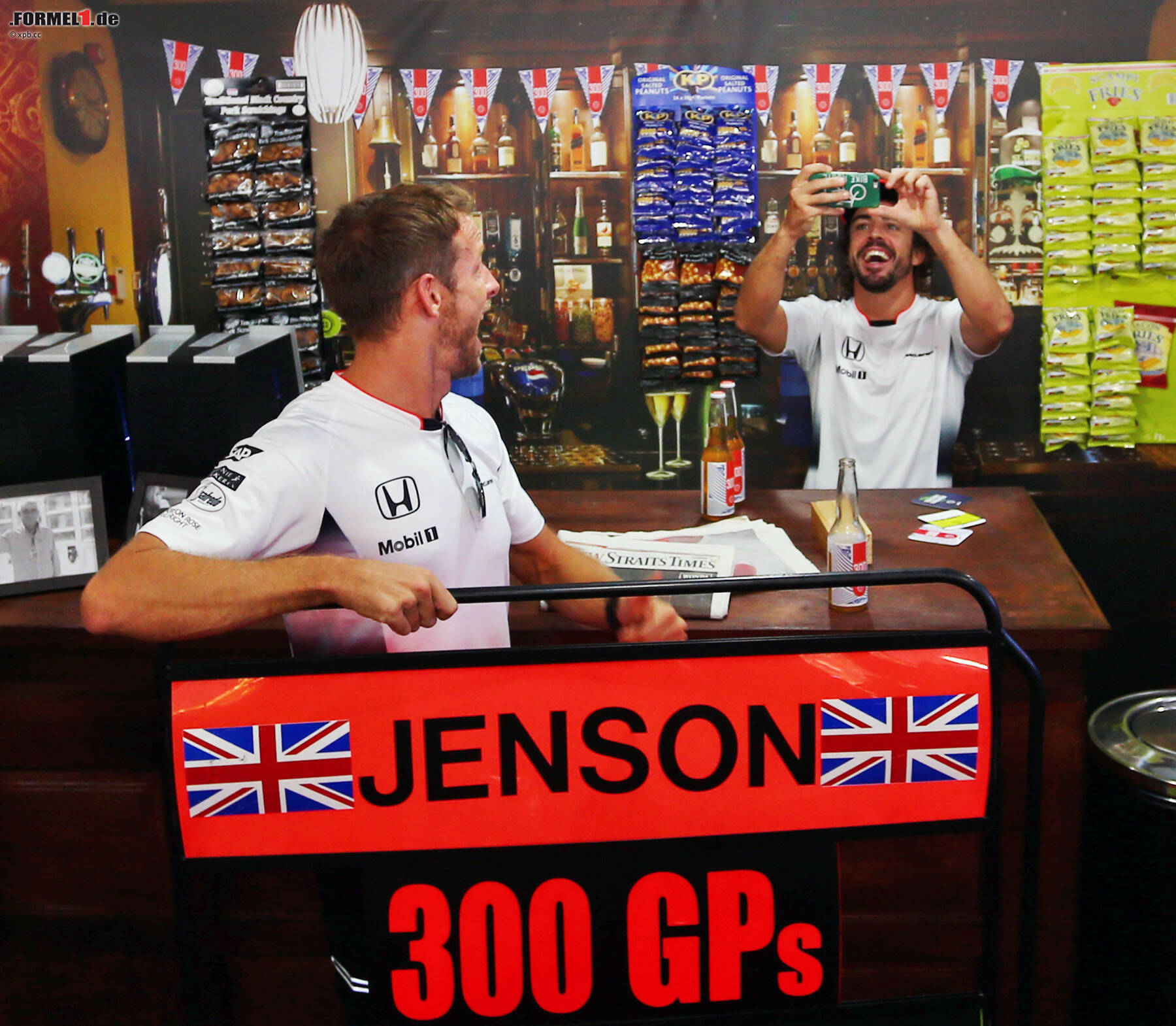 Eines der zentralen Themen ist diesmal die Feier anlässlich Jenson Buttons 300. Grand Prix. Das McLaren-Team verwandelte die Hospitality in Sepang dafür in ein typisch britisches Pub, und neben dutzenden Journalisten und anderen Gästen kamen natürlich auch viele Fahrerkollegen. Der eine oder andere - Lewis Hamilton übrigens nicht - gönnte sich bei der Gelegenheit ausnahmsweise mal einen Schluck Cider (Fotos 1 bis 5).