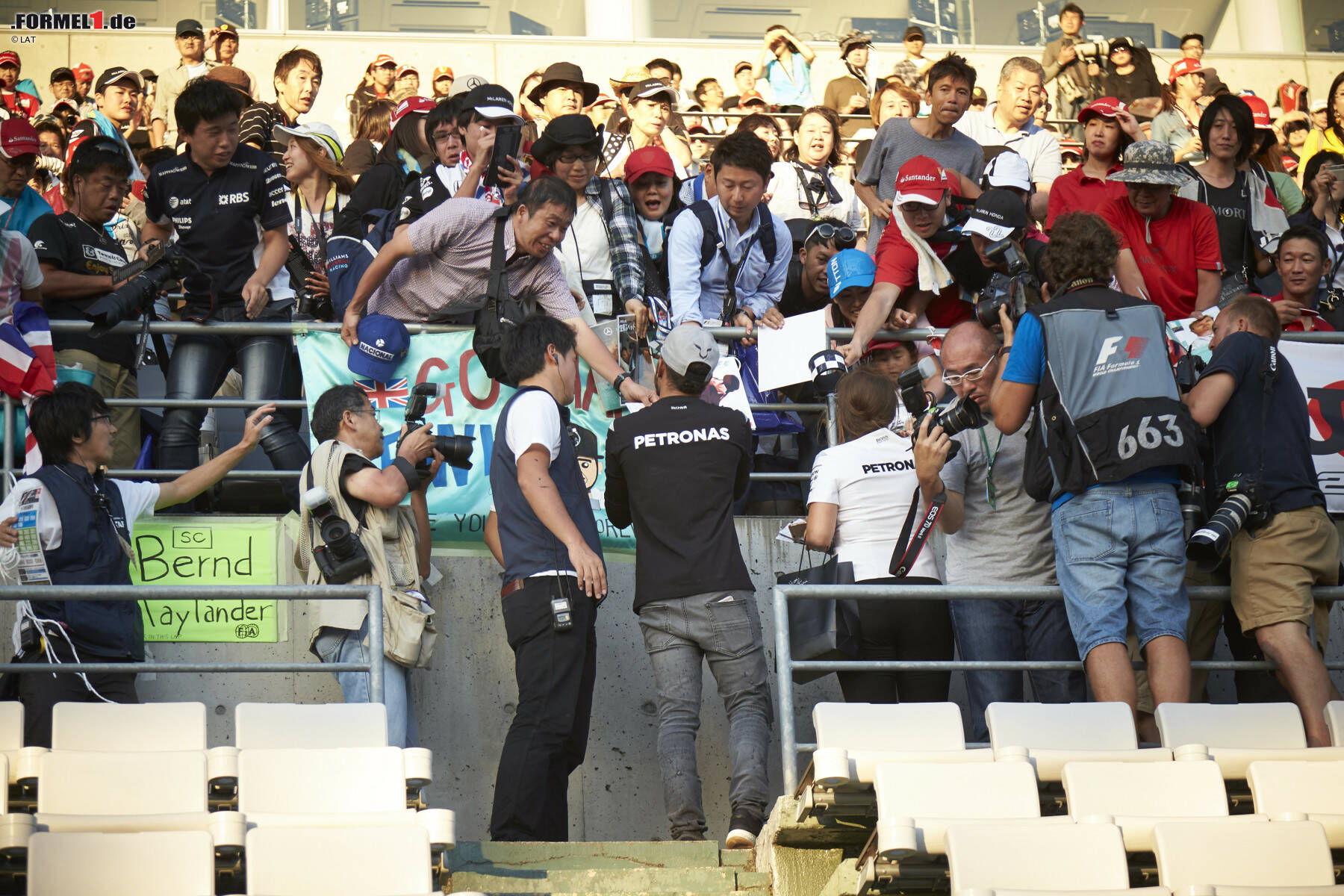Ebenfalls abgebildet sind die verrücktesten Auswüchse der japanischen Fans, bis hin zu einem Foto, auf dem sich Nico Rosberg und Tennis-Superstar Novak Djokovic gegenseitig Autogramm-Nachrichten schreiben (Foto 6). Oder ein Helm, den Martin Brundle gutgläubig signiert hat - und am nächsten Morgen für 3.500 Pfund in der Auslage eines Fanartikelverkäufers fand (Foto 10).