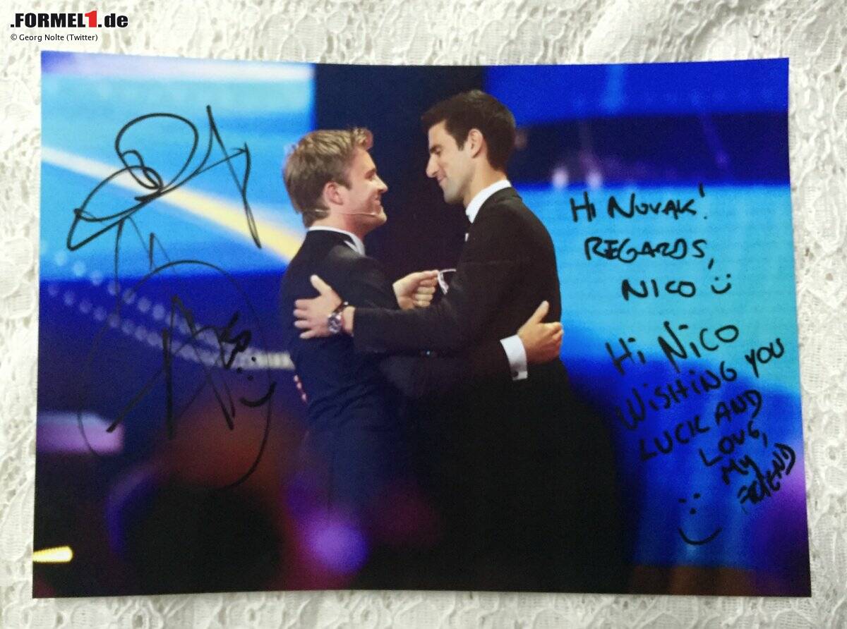 Ebenfalls abgebildet sind die verrücktesten Auswüchse der japanischen Fans, bis hin zu einem Foto, auf dem sich Nico Rosberg und Tennis-Superstar Novak Djokovic gegenseitig Autogramm-Nachrichten schreiben (Foto 6). Oder ein Helm, den Martin Brundle gutgläubig signiert hat - und am nächsten Morgen für 3.500 Pfund in der Auslage eines Fanartikelverkäufers fand (Foto 10).