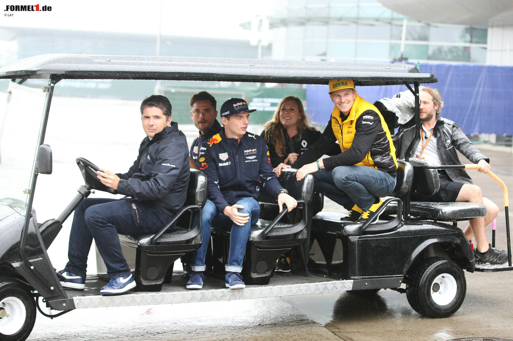 Also bilden sich Fahrgemeinschaften, um die Transportzeit von A nach B zu verkürzen. Hier teilen sich Max Verstappen und Nico Hülkenberg (jeweils samt Team-Medienbetreuer) ein "Taxi".