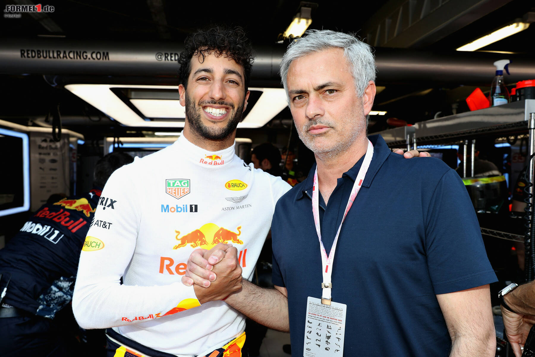 Gegensätzlicher könnten Gesichtsausdrücke wohl kaum sein: Der ewige Sonnyboy Daniel Ricciardo mit Jose Mourinho, dem Griesgram-Coach von Manchester United.