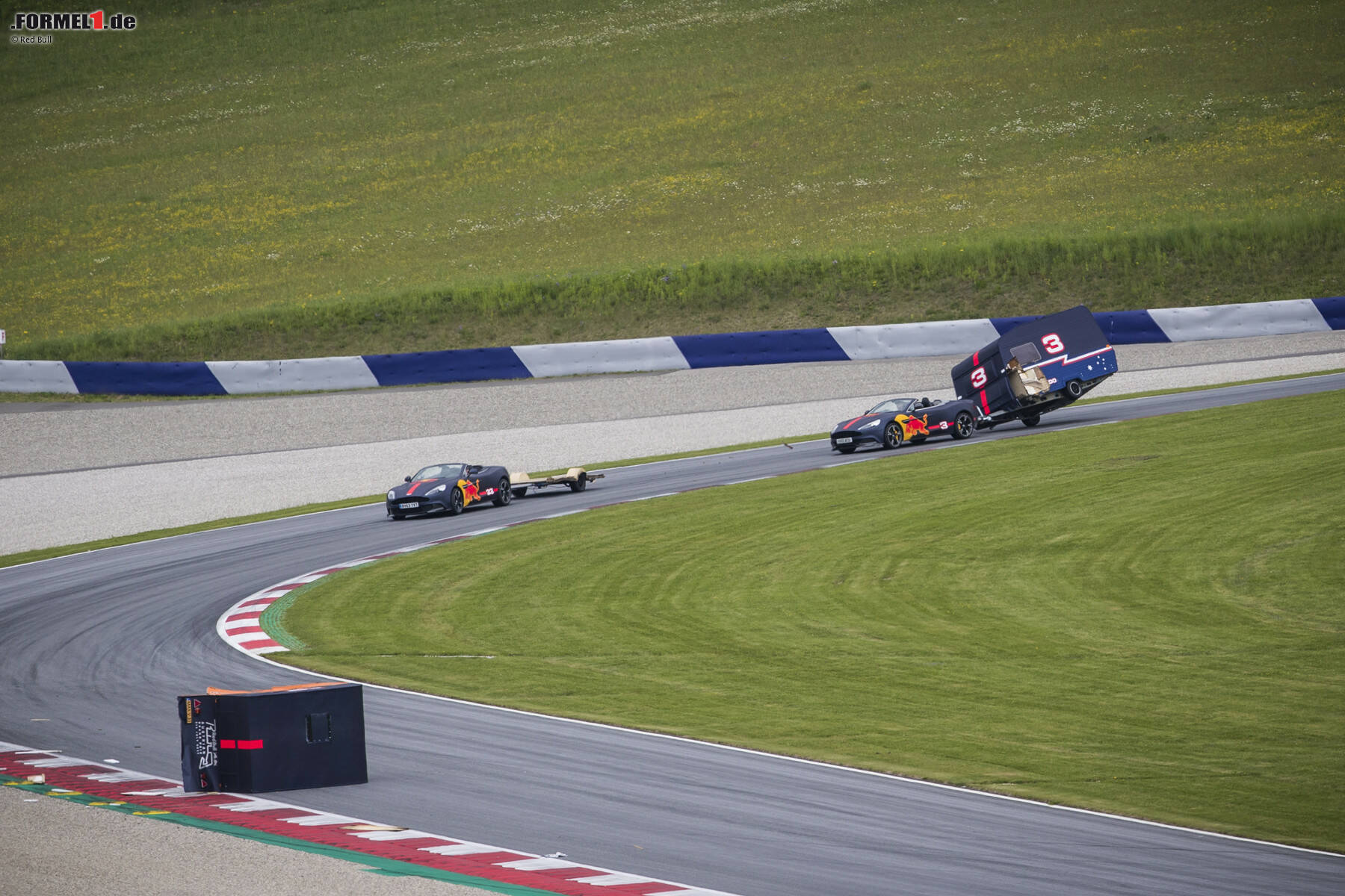 Für einen Promo-Clip zum Heim-Rennen in Spielberg liefern sich die Red-Bull-Piloten ein heißes Wohnwagen-Duell auf der Rennstrecke - Am Ende bleibt nur Kleinholz