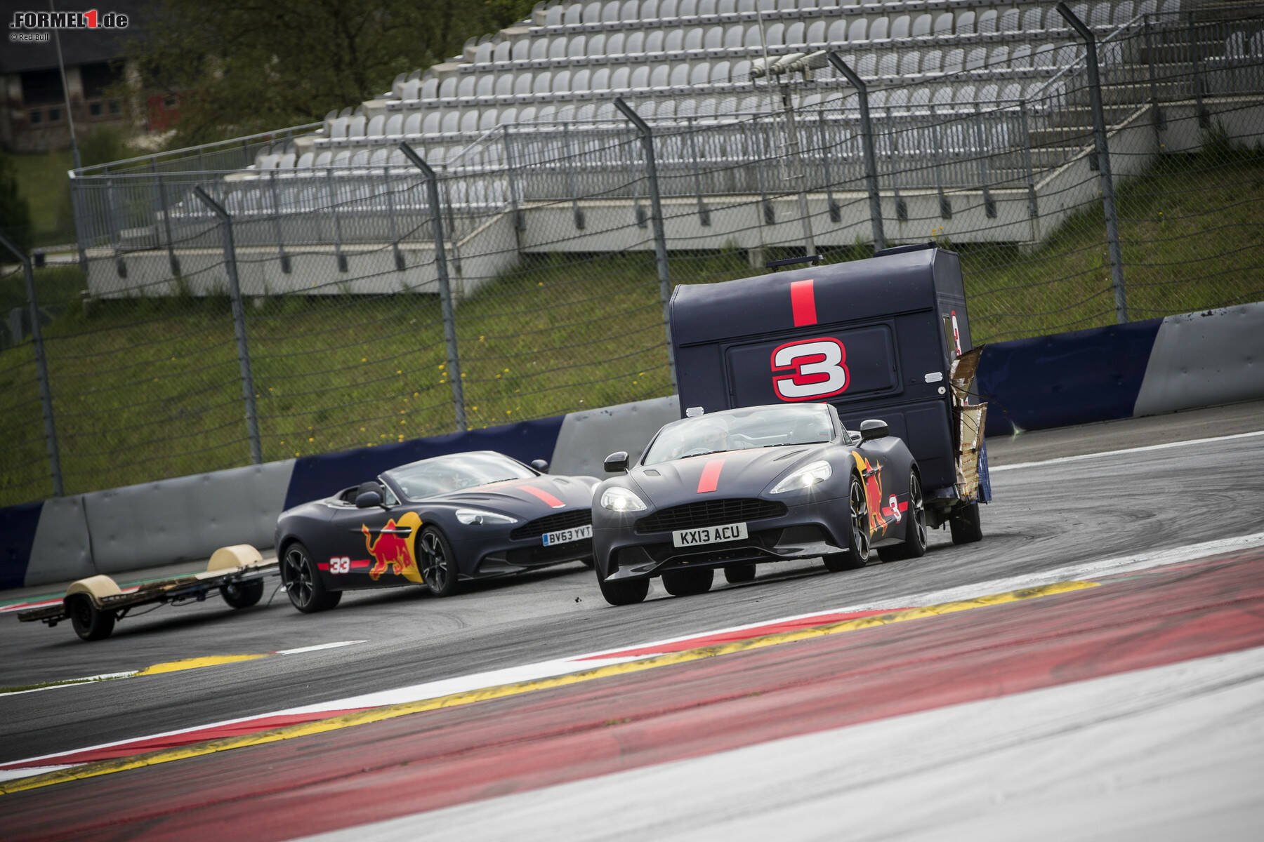 Für Red Bull ist der Clipdreh Teil der Marketingaktion für das Heimrennen in Spielberg in gut fünf Wochen. Dafür ließen sich die Werbestrategen einiges einfallen: Die Boliden im Video sind zwei Aston Martin Vanquish Cabriolets, die in unter 3,8 Sekunden von 0 auf 100 Kilometer pro Stunde beschleunigen. Eigens wurden an die rund 600 PS starken Wagen Anhängerkupplungen montiert, während an den Campern Pirelli-Slickreifen für den nötigen Grip aufgezogen wurden.