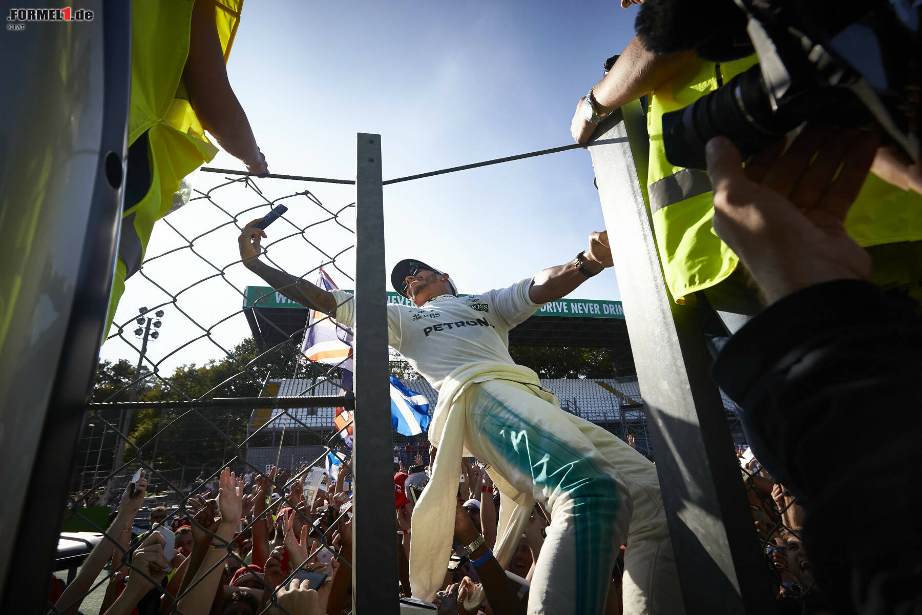 "Mercedes-Power ist besser als Ferrari-Power", provoziert Sieger Lewis Hamilton die ihn ausbuhenden Tifosi. Aber er versteht die Leidenschaft der Ferrari-Fans und respektiert diese. Das bekommt er zurück: Beim Bad in der Menge wird der Mercedes-Star frenetisch gefeiert. Auch von den Ferrari-Anhängern.