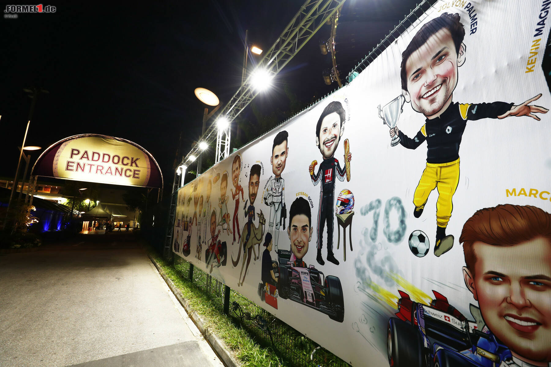 ... und Herren! Von den Fahrer-Karikaturen am Paddock-Eingang gefällt uns der Bottas-Muskelmann am besten. Aber dass die Zeichner Jolyon Palmer mit Siegerpokal abgebildet haben, zeigt, dass das Publikum in Singapur in Sachen Fachkunde noch aufzuholen hat.