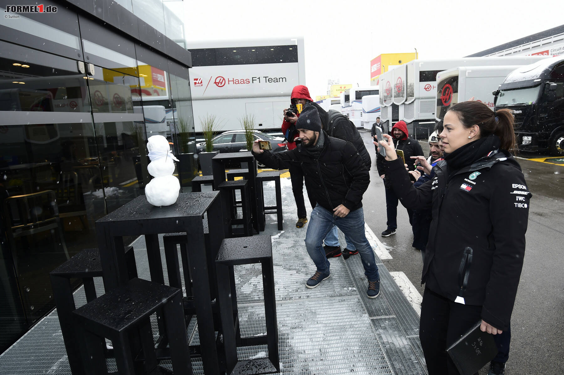 Schneefall beim Barcelona-Test: Die Mercedes-Fahrer hatten am Mittwoch nichts zu tun, die PR-Abteilung aber ließ sich etwas einfallen ...