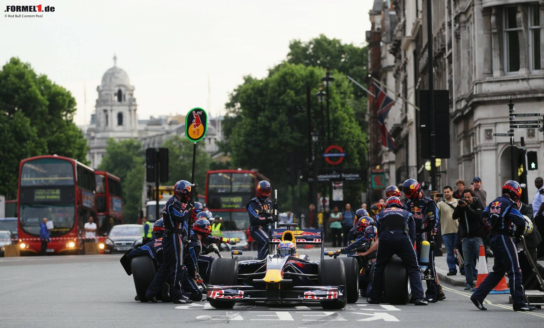 Boxenstopp in London: Ein Rennen rund um die Sehenswürdigkeiten der britischen Hauptstadt ist ein Lebenstraum Bernie Ecclestones. Red Bull und Mark Webber gaben ihm 2010 ein Gesicht.
