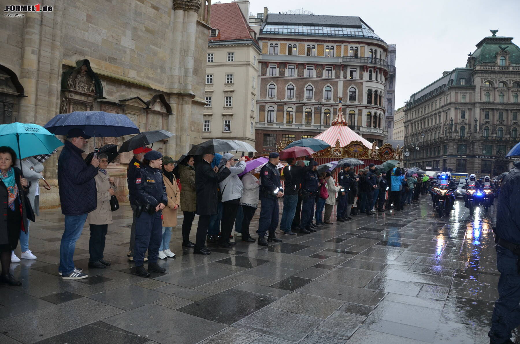 Die Abschiedszeremonie begann um 8:00 Uhr, als Laudas Sarg in einem grauen Wagen der Bestattung Wien am Stephansdom eintraf. Natürlich mit Polizeieskorte. Zu jenem Zeitpunkt hatten sich schon unzählige Menschen vor dem Dom eingefunden - trotz des schlechten Wetters.