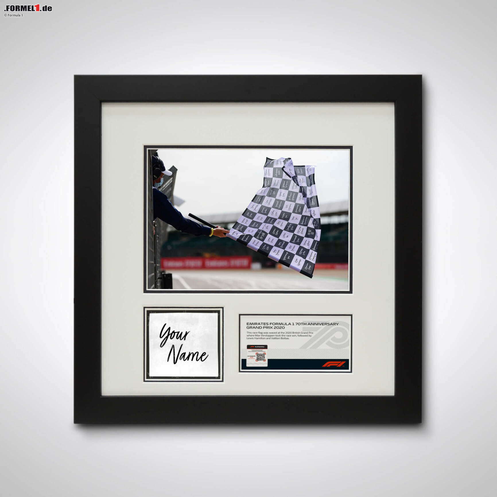 Diese Flagge wird am 11. Oktober 2020 den Sieger des Rennens abwinken und auf ewig mit diesem Grand Prix verbunden bleiben. Und das Beste ist: Sie erhalte ein gerahmtes, von einem professionellen Fotografen erstelltes Bild vom Moment der Zieleinfahrt, ergänzt um das Quadrat mit ihrem Namen und einer Plakette mit einem Hologramm, um die Echtheit zu garantieren.