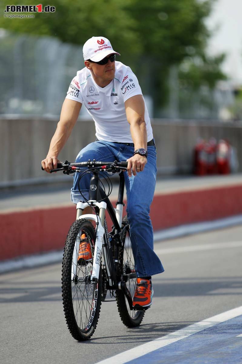 ...oder zur Streckenerkundung. Auch auf dem Fahrrad ist Michael Schumacher regelmäßig unterwegs.
