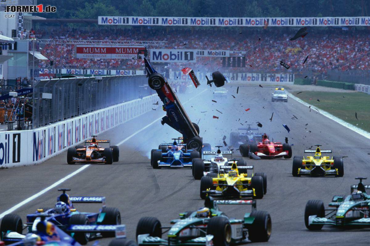 Auch 2001 knallt es am Start. Luciano Burti steigt über den ohne Vortrieb rollenden Ferrari von Michael Schumacher auf und hebt ab. Glücklicherweise geht der Unfall glimpflich aus.