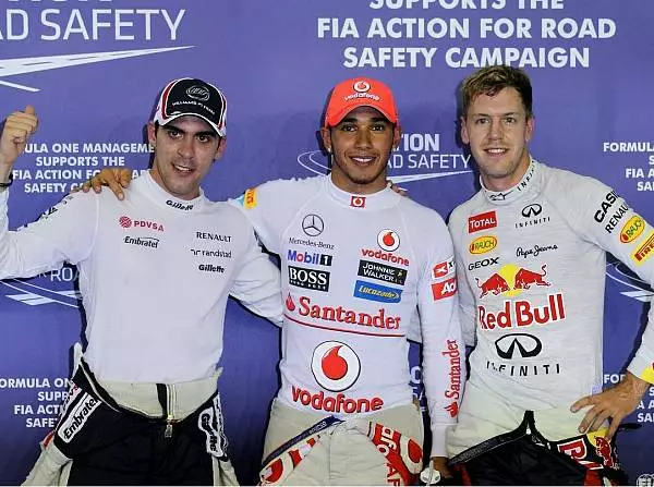 (Motorsport-Total.com) - Mit einer faustdicken Überraschung endete das heutige Qualifying zum Grand Prix von Singapur: Zwar lieferten sich Topfavorit Sebastian Vettel (Red Bull) und Lewis Hamilton (McLaren) in Q1 und Q2 das erwartete Pole-Position-Duell, doch im Top-10-Finale erhielten die beiden unerwartete Gesellschaft. Denn nicht Vettel, sondern Williams-Pilot Pastor Maldonado wird morgen um 20:00 Uhr Ortszeit neben Polesetter Hamilton ins Nachtrennen starten.