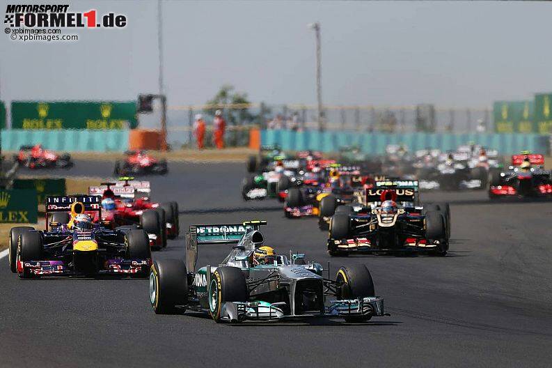 Doch der Reihe nach: Beim Start kam Pole-Sitter Hamilton prima weg und bog, wie erhofft, als Erster in die erste Kurve ein. Und dahinter entwickelten sich schon die ersten Scharmützel, weil Vettel nicht optimal losgekommen war. Er reihte sich dennoch als Zweiter hinter Hamilton ein, Romain Grosjean (Lotus) folgte als Dritter, dahinter dann schon die beiden Ferrari von Fernando Alonso und Massa.