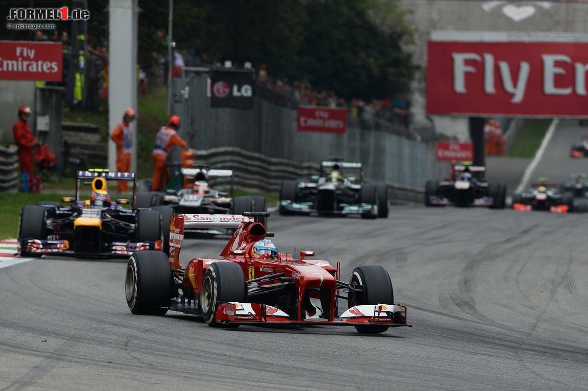 "Das Auto war okay. Ich hatte einen kleinen Zusammenstoß mit Nico Hülkenberg beim Start. Der zweite Platz ist in Ordnung. Hoffentlich kann ich im kommenden Jahr mal ganz oben auf dem tollsten Podium der Welt stehen", gibt Alonso den italienischen Fans vom Podest mit auf den Weg. Der Spanier musste spätestens nach zwei Dritteln der Renndistanz erkennen, dass es keine Chance auf den Sieg geben würde. Im Gegenteil: Mark Webber kam von hinten auf.