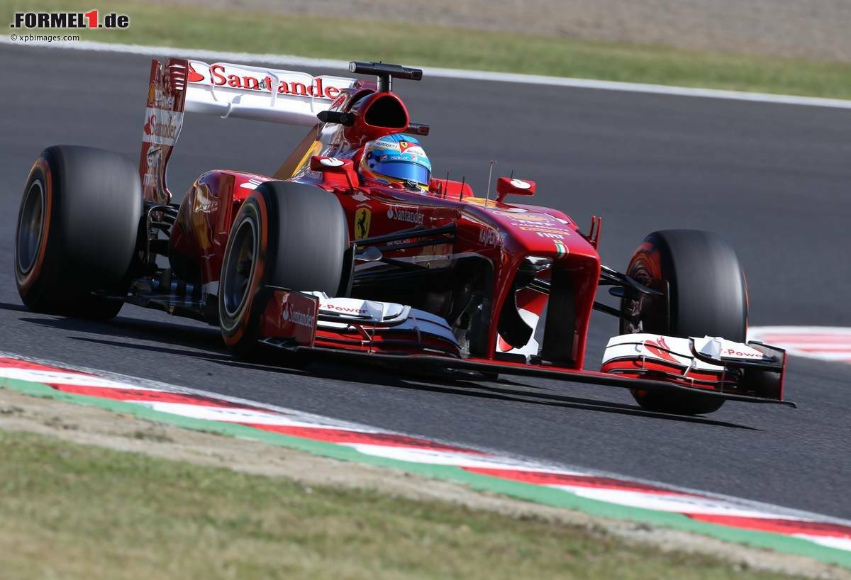 Wie schwierig Suzuka ist, musste auch Fernando Alonso (10./+1,235) feststellen, der mit seinem Ferrari ausgangs Degner-Kurve einen Dreher fabrizierte. Während der Volltank-Tests klagte er lange Zeit über Vibrationen auf den Medium-Reifen, nach einem Boxenstopp lief es aber besser und er schaffte noch eine Verbesserung auf 1:39.0 Minuten. Absolut gesehen war er heute sogar langsamer als Teamkollege Felipe Massa (8./+0,846) - und zwar in beiden Sessions.