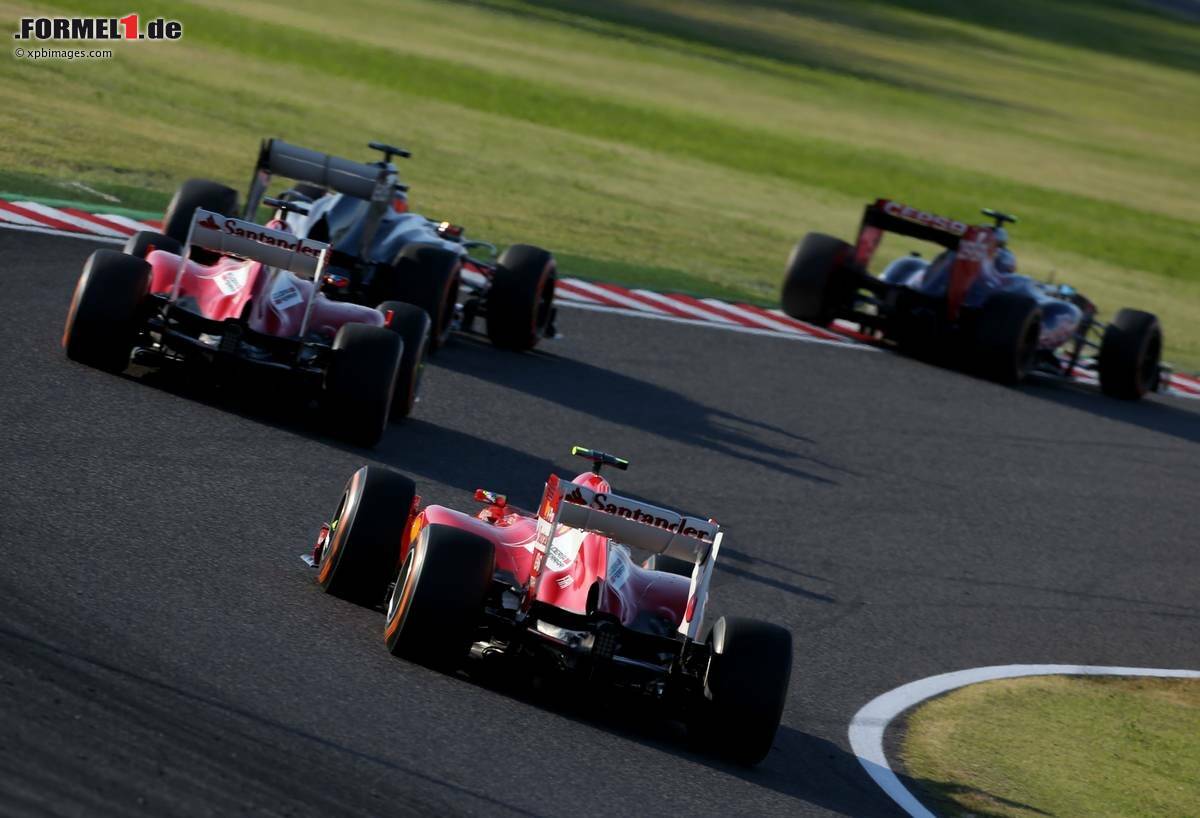 (Motorsport-Total.com) - Die Plätze vier und zehn wären für Ferrari noch vor einigen Jahren eine Katastrophe gewesen, beim Japan-Grand-Prix am Sonntag waren die Italiener mit dieser Ausbeute einigermaßen beseelt. Schließlich hatte schon das zum wiederholten Male verkorkste Qualifying die Hoffnungen auf ein Podium praktisch zunichte gemacht. Fernando Alonso sieht sich nicht unter Wert geschlagen: "Egal, mit welcher Strategie: Wir wären Vierter geworden. Egal, mit welcher Startposition: Wir wären Vierter geworden."