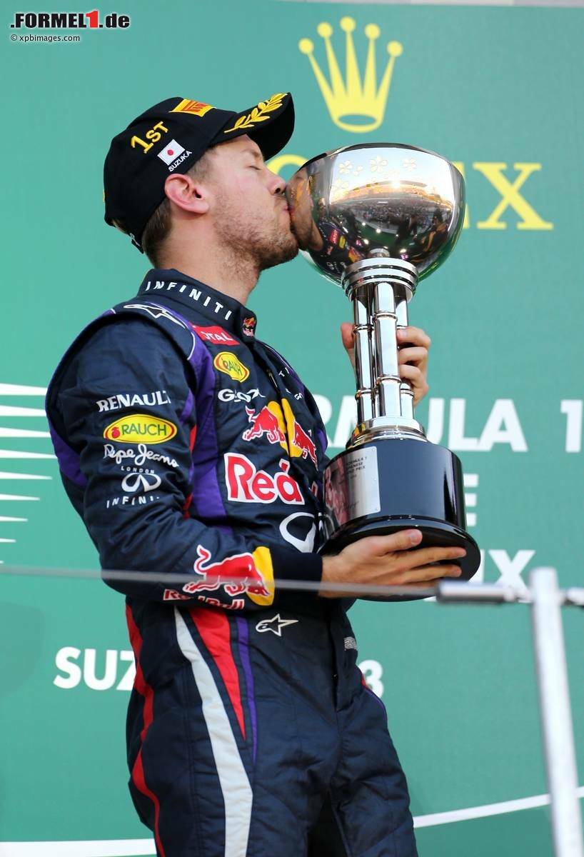 (Motorsport-Total.com) - Sebastian Vettel ist seinem vierten WM-Titel beim Grand Prix von Japan wieder einen Schritt näher gekommen, ganz zu ist der Sack aber noch nicht. Der Red-Bull-Pilot gewann heute das Rennen im sonnigen Suzuka vor seinem Teamkollegen Mark Webber und Romain Grosjean (Lotus) und hat damit in der Fahrerwertung 90 Punkte Vorsprung auf Fernando Alonso (Ferrari), der als Vierter ins Ziel kam und damit rein rechnerisch letzter verbliebener Vettel-Gegner ist.