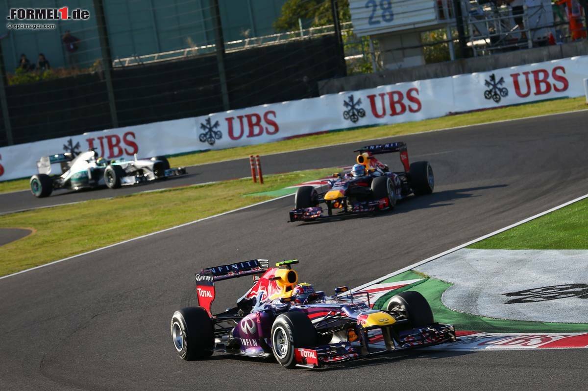 (Motorsport-Total.com) - Sebastian Vettel ist seinem vierten WM-Titel beim Grand Prix von Japan wieder einen Schritt näher gekommen, ganz zu ist der Sack aber noch nicht. Der Red-Bull-Pilot gewann heute das Rennen im sonnigen Suzuka vor seinem Teamkollegen Mark Webber und Romain Grosjean (Lotus) und hat damit in der Fahrerwertung 90 Punkte Vorsprung auf Fernando Alonso (Ferrari), der als Vierter ins Ziel kam und damit rein rechnerisch letzter verbliebener Vettel-Gegner ist.