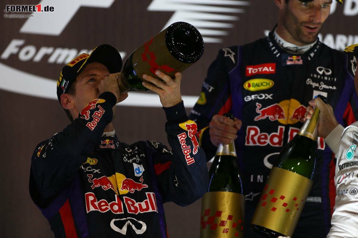 (Motorsport-Total.com) - Dieses war der siebte Streich - und der achte folgt sogleich? Scheinbar ist niemand in der Lage, Sebastian Vettels Siegeszug zu stoppen. Auch in Abu Dhabi fuhr der Red-Bull-Pilot als Sieger über die Ziellinie und wies die Konkurrenz dominant in ihre Schranken. Über eine halbe Minute Vorsprung hatte der Heppenheimer zum Schluss auf seinen Teamkollegen Mark Webber und war damit ähnlich souverän wie in Singapur.