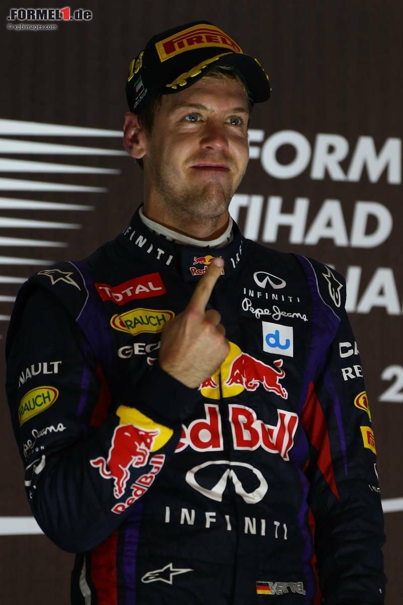 (Motorsport-Total.com) - Dieses war der siebte Streich - und der achte folgt sogleich? Scheinbar ist niemand in der Lage, Sebastian Vettels Siegeszug zu stoppen. Auch in Abu Dhabi fuhr der Red-Bull-Pilot als Sieger über die Ziellinie und wies die Konkurrenz dominant in ihre Schranken. Über eine halbe Minute Vorsprung hatte der Heppenheimer zum Schluss auf seinen Teamkollegen Mark Webber und war damit ähnlich souverän wie in Singapur.