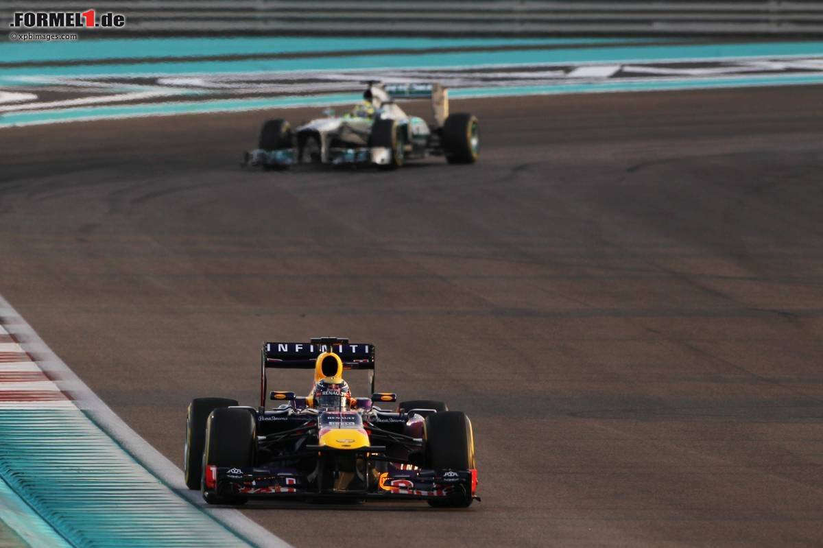 (Motorsport-Total.com) - Dieses war der siebte Streich - und der achte folgt sogleich? Scheinbar ist niemand in der Lage, Sebastian Vettels Siegeszug zu stoppen. Auch in Abu Dhabi fuhr der Red-Bull-Pilot als Sieger über die Ziellinie und wies die Konkurrenz dominant in ihre Schranken. Über eine halbe Minute Vorsprung hatte der Heppenheimer zum Schluss auf seinen Teamkollegen Mark Webber und war damit ähnlich souverän wie in Singapur.