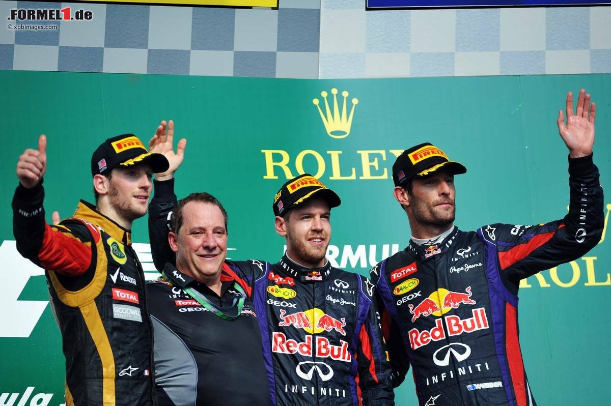 Er glaubt, dass die Formel 1 endgültig eine neue Heimat gefunden hat: "Die Stadt dreht durch, es ist einer der besten Grand Prix der Saison." Auch für Stardesigner Adrien Newey und seine Mechanikertruppe gibt es mal wieder verbale Streicheleinheiten: "Das Auto war fantastisch", sagt der Weltmeister über einen überlegenen RB9. Geschwitzt hatte Vettel nur unmittelbar nach der grünen Ampel, als der Lotus von Startplatz drei plötzlich groß in den Rückspiegeln auftauchte. "Am Start war es knapp, weil Romain sehr gut wegkam", erinnert sich der 26-Jährige.