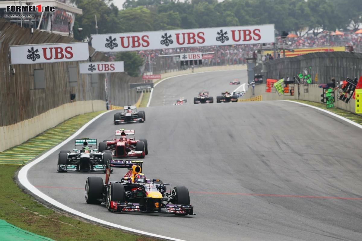 (Motorsport-Total.com) - Sebastian Vettel hat der Formel-1-Saison 2013 seinen Stempel aufgedrückt - und diese beim Grand Prix von Brasilien standesgemäß mit einem Sieg beendet. Der Red-Bull-Pilot gewann das 71 Runden lange Rennen 10,4 Sekunden vor seinem Teamkollegen Mark Webber und 18,9 Sekunden vor Fernando Alonso (Ferrari). Im Kampf um Platz zwei in der Konstrukteurs-WM behielt Mercedes gegen Ferrari die Oberhand. Letztendlich gaben sechs Punkte Unterschied den Ausschlag.
