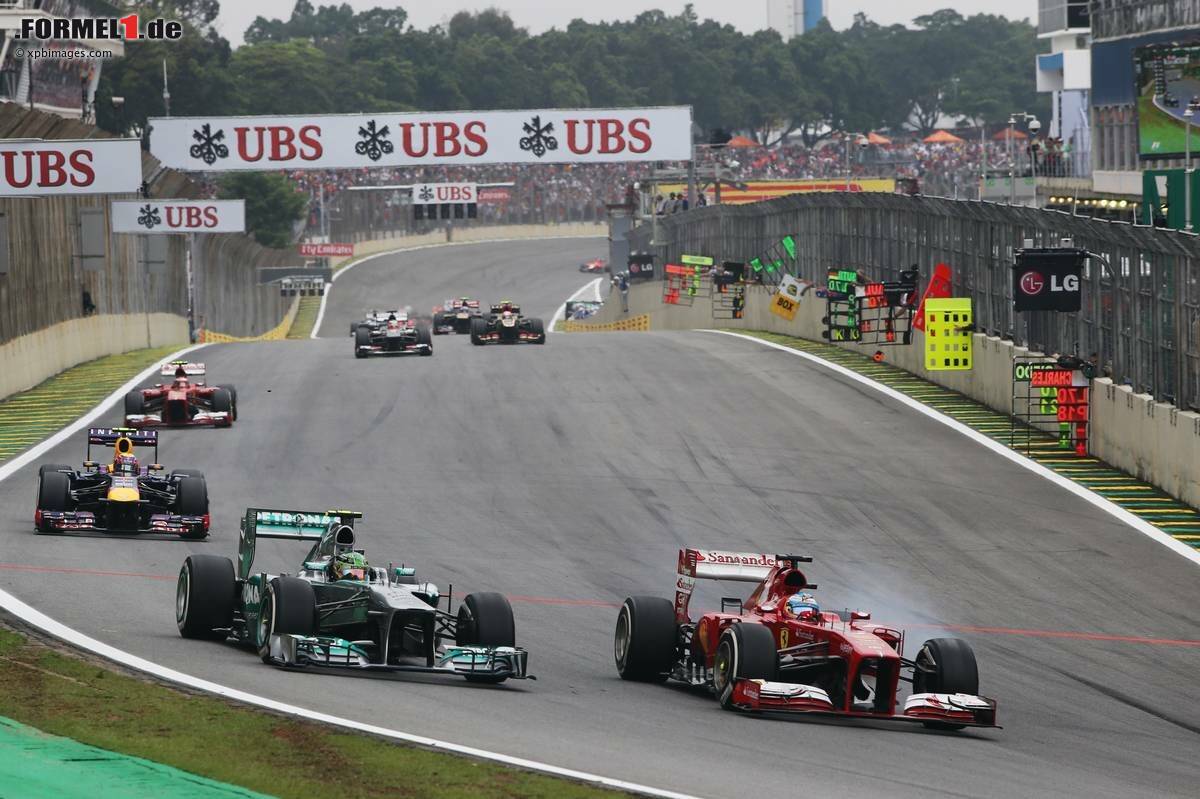 (Motorsport-Total.com) - Sebastian Vettel hat der Formel-1-Saison 2013 seinen Stempel aufgedrückt - und diese beim Grand Prix von Brasilien standesgemäß mit einem Sieg beendet. Der Red-Bull-Pilot gewann das 71 Runden lange Rennen 10,4 Sekunden vor seinem Teamkollegen Mark Webber und 18,9 Sekunden vor Fernando Alonso (Ferrari). Im Kampf um Platz zwei in der Konstrukteurs-WM behielt Mercedes gegen Ferrari die Oberhand. Letztendlich gaben sechs Punkte Unterschied den Ausschlag.